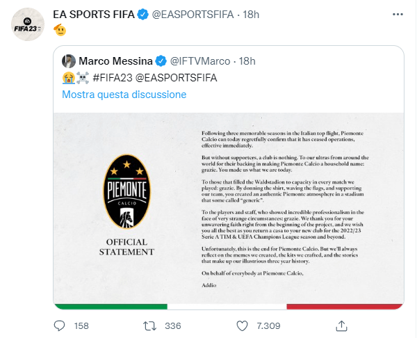 A seguire possiamo vedere come EA Sports abbia scherzato sul fatto del Piemonte Calcio, dopo il retweet di un presunto “official statement” del Piemonte Calcio pubblicato sul medesimo social: